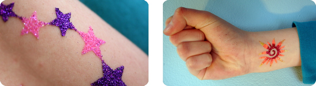 These popular glitter tattoos can last up to a week and can be easily removed with baby oil.